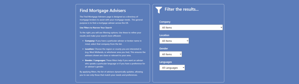| Search by Gender, Location, Language, or Expertise | The Connect Experts directory allows you to refine your search and find an adviser who truly understands your needs: • By gender: Choose an adviser you feel most comfortable with. • By location: Connect with local brokers who understand your property market. • By language: Find advisers who speak your preferred language for clear communication. • By expertise: Search for specialists in buy-to-let, commercial, bridging, or residential mortgages. With these options, you are always matched with a professional who understands your goals and preferences. |